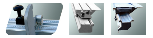 2、 移动滑动台采用高强度铝合金制造、表面氧化强度高、多腔结构不变形 3、 主锯片及划线锯片高度调整,手轮转动升降。